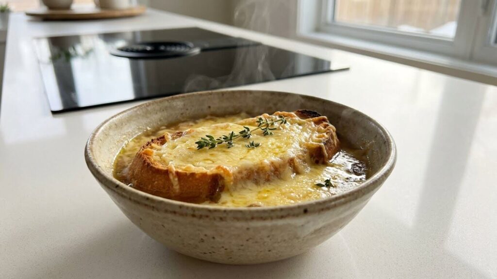 A classic French onion soup made without wine, featuring deeply caramelized onions, rich beef broth, and a golden Gruyère topping. This alcohol-free version delivers the same bistro-style depth and comfort, using simple techniques to build rich, balanced flavor at home.