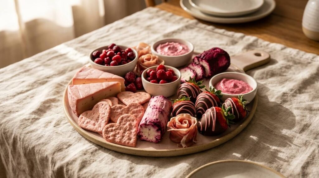 These Galentine’s charcuterie board ideas focus on pink hues, sweet-and-savory balance, and crowd-pleasing bites that feel special without being complicated. Mix store-bought favorites with a few homemade touches, and you’ll have a board that looks Instagram-ready and tastes even better.