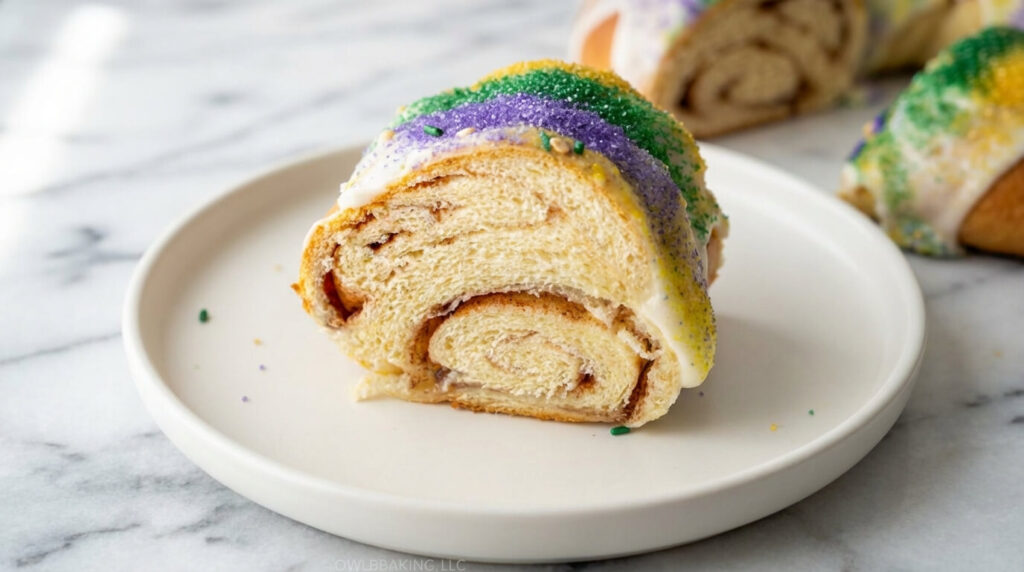 Keywords: king cake, Mardi Gras, cinnamon roll, brioche, traditional cake