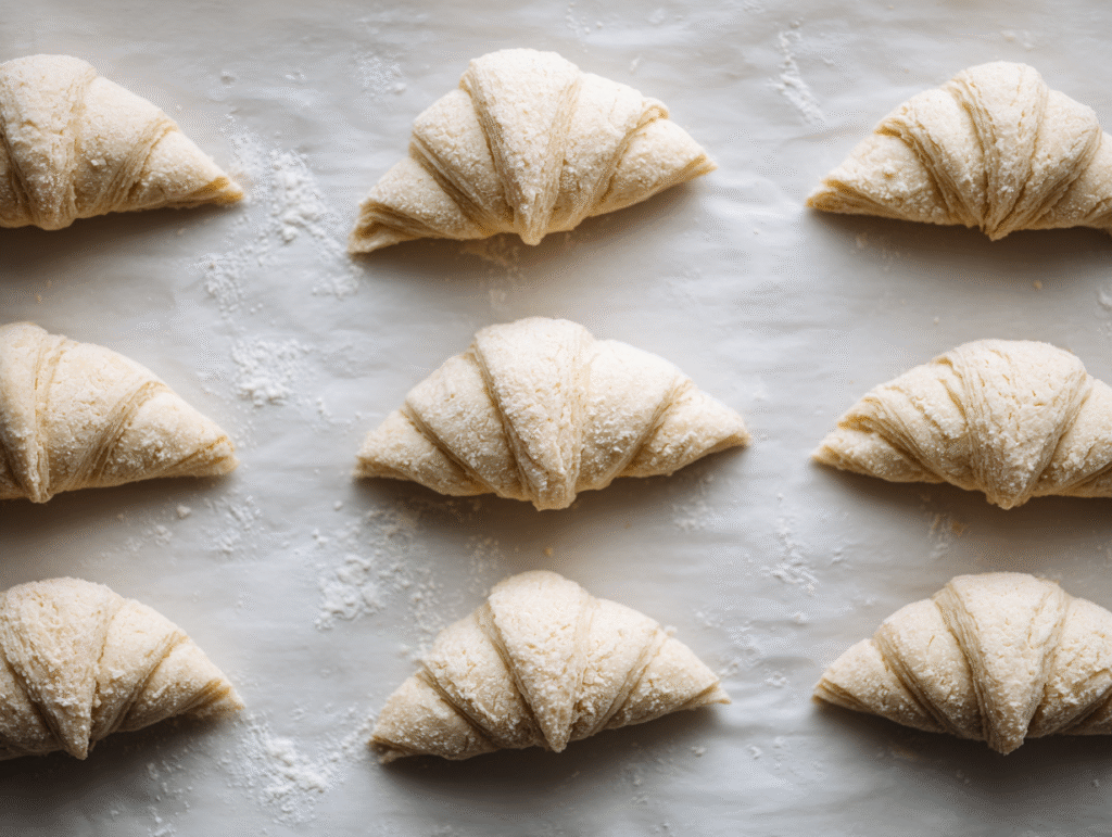 - Trim edges and cut into 8–10 long triangles. Roll from wide base to tip, shaping like croissants. Place on parchment-lined sheet.