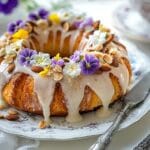 Decorated pastry ring with frosting, toasted almonds, and edible flowers on a ceramic platter.