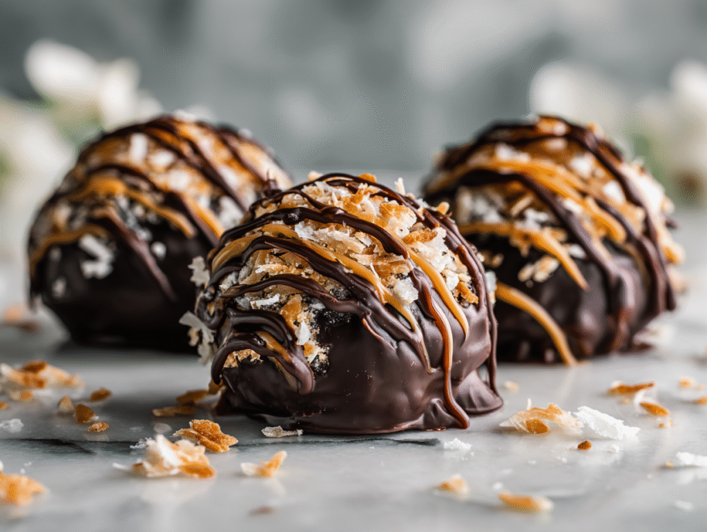 Samoa truffles with toasted coconut, caramel drizzle, and chocolate coating